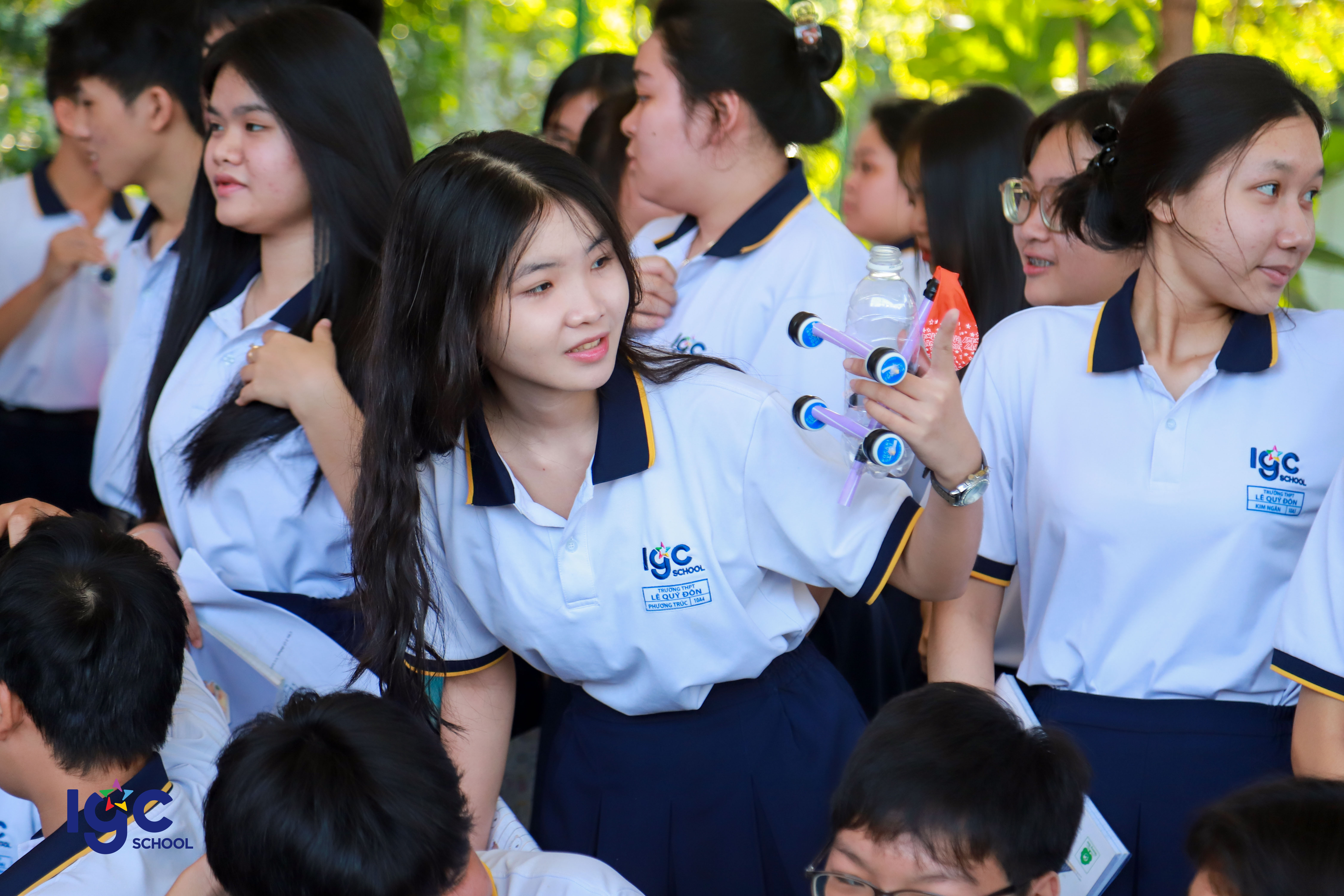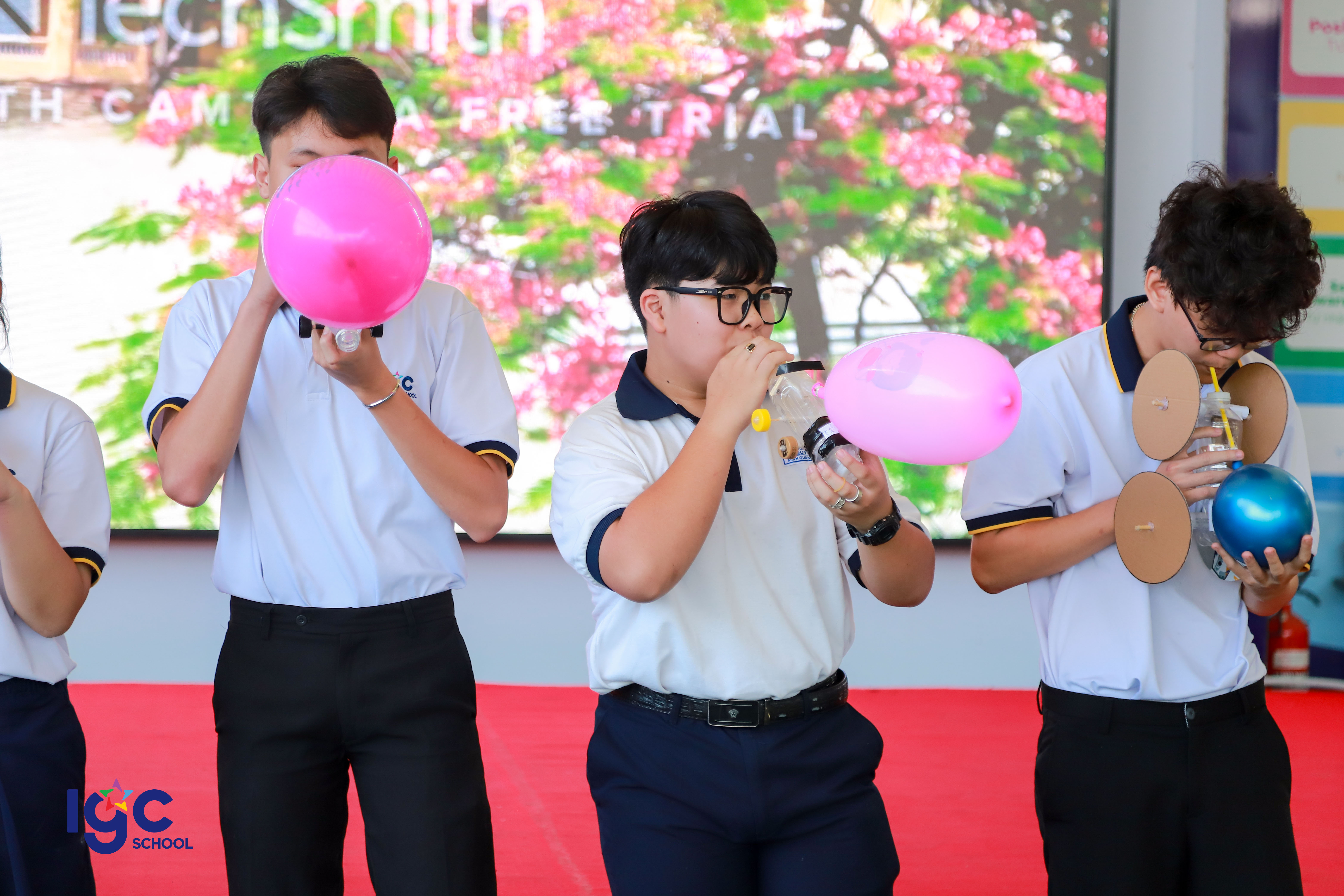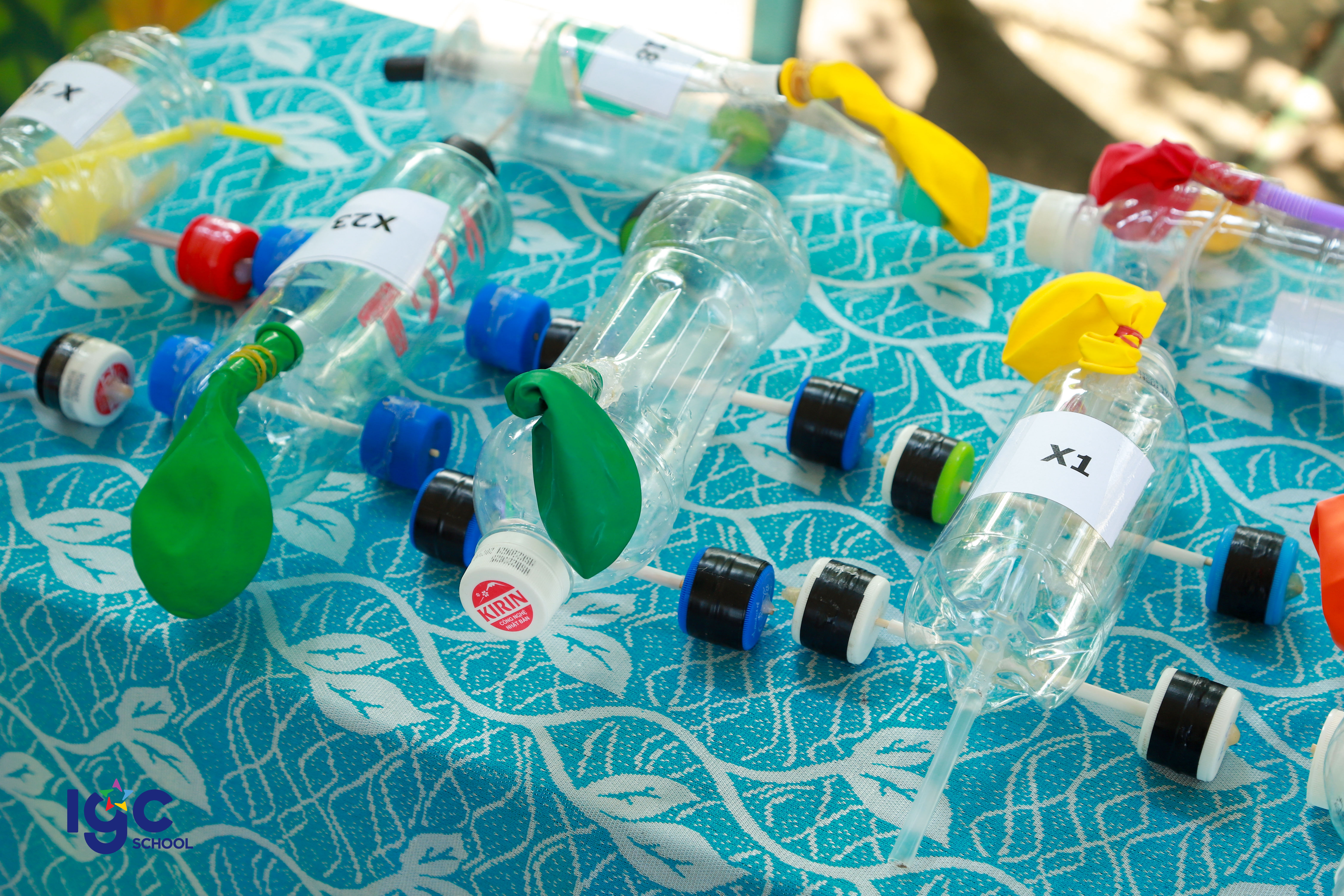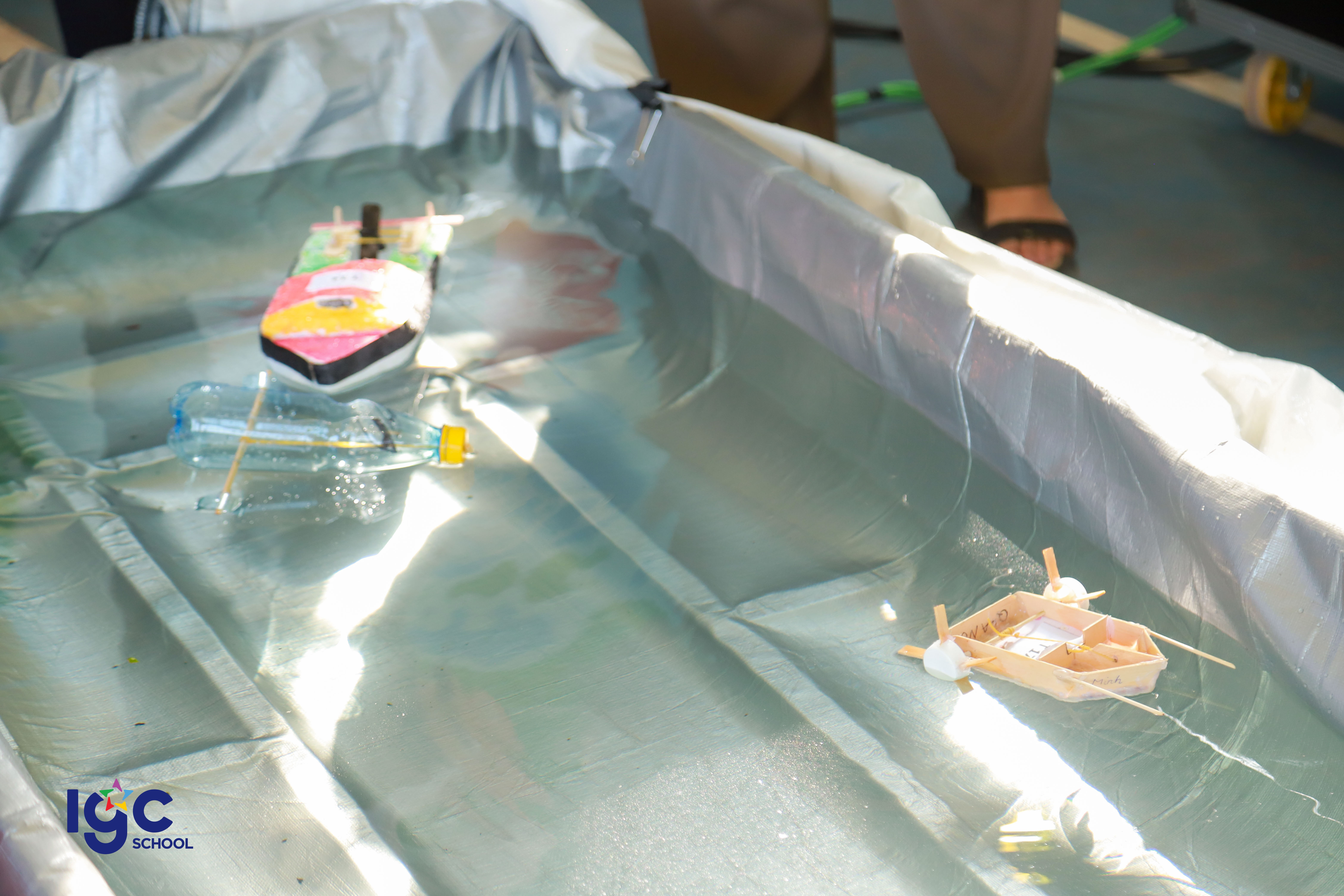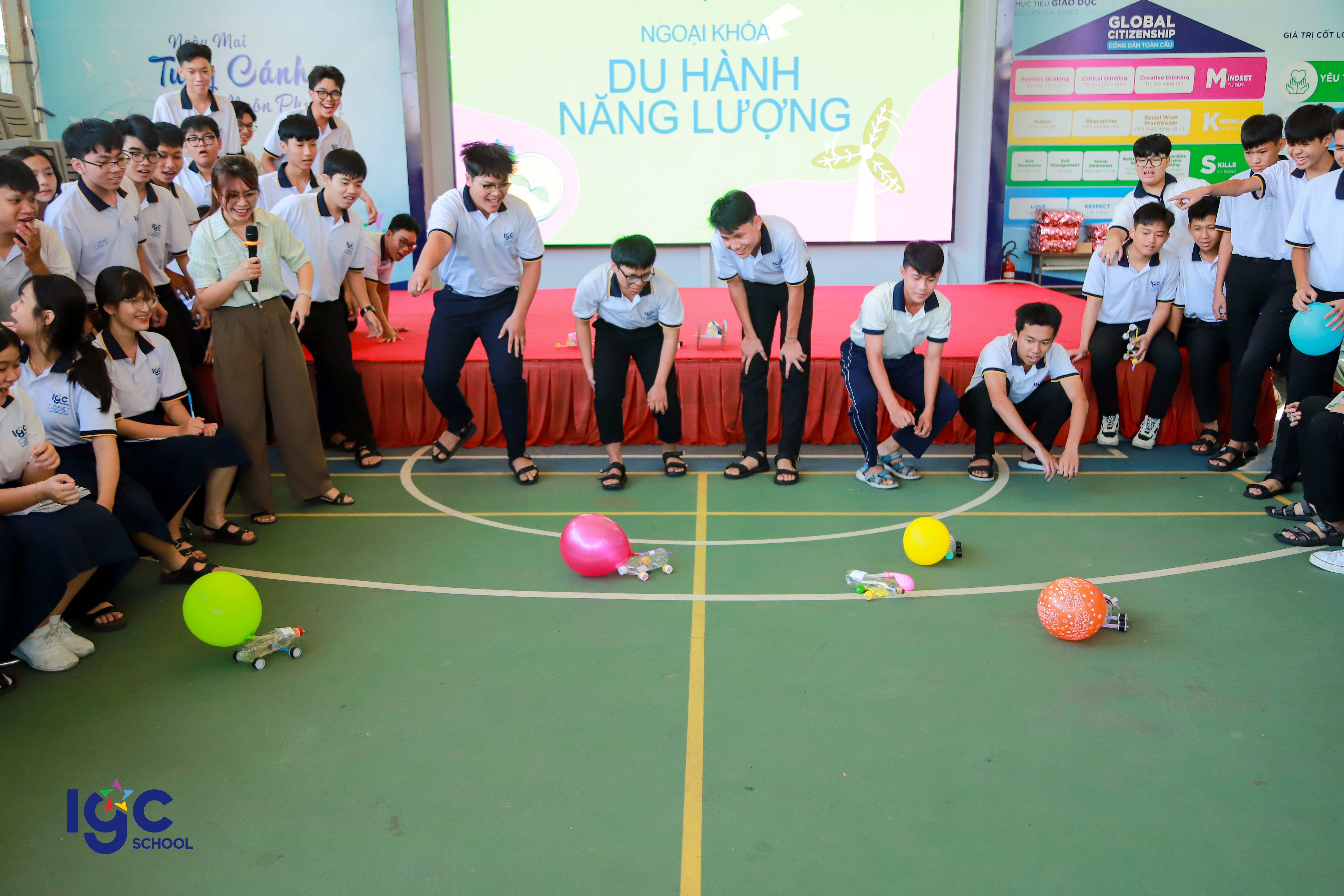 Với chủ đề "Du hành năng lượng", học sinh khối 10 đã có cơ hội khám phá và ứng dụng kiến thức Vật lý vào thực tiễn thông qua các hoạt động trải nghiệm đầy hấp dẫn! **Đua xe bong bóng**: nơi các bạn học sinh tự thiết kế và chế tạo những chiếc xe sử dụng nguyên lý phản lực của khí để di chuyển. **Đua thuyền**: thử thách sáng tạo với những chiếc thuyền nhỏ do chính tay học sinh làm ra, vận hành dựa trên nguyên tắc xoắn của dây chun làm cho cánh quạt quay tạo ra lực đẩy thuyền chạy trên mặt nước . **Mở túi mù – Giải câu hỏi**: một thử thách bất ngờ yêu cầu học sinh vận dụng tư duy nhanh nhạy, kiến thức Vật lý để vượt qua chướng ngại vật. **Các bạn học sinh đã có một hành trình khám phá năng lượng đầy sáng tạo và bổ ích. Đây không chỉ là một buổi ngoại khóa mà còn là cơ hội để các bạn rèn luyện kỹ năng làm việc nhóm, tư duy khoa học và khả năng sáng tạo.